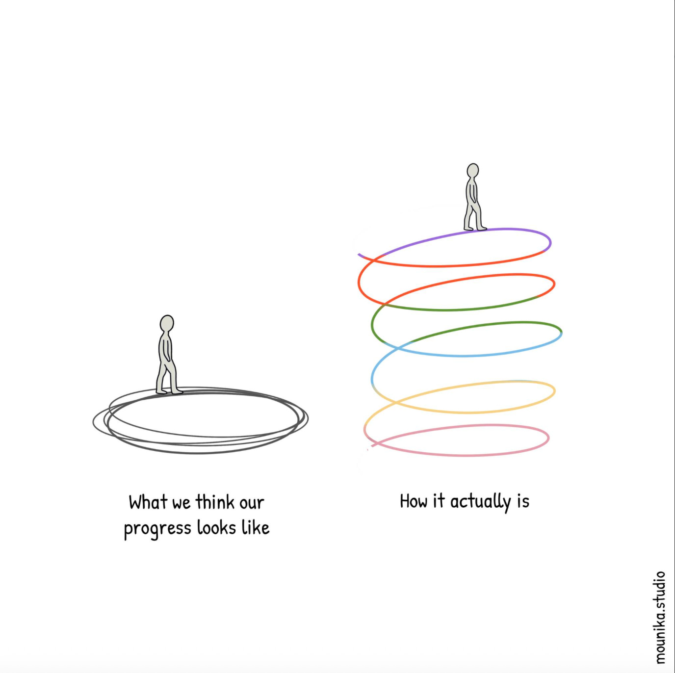 As a coach, I think about this often, because clients invest in coaching in order to make progress. And yet, it can be challenging to identify: How are you measuring progress? What if we diverge? How will you know you’re making progress, knowing that progress isn’t linear?