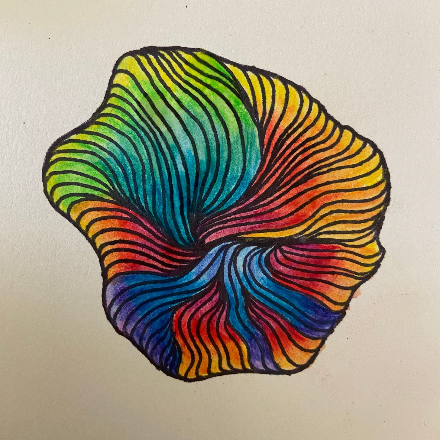 One of my favorite ways to draw lines is to make watercolor 'blobs’ first and then use the shape of the different colors and shades as a guide for my lines. If you’d like to try this out, I invite you to prepare some blobs ahead of time (marker or highlighter works, too!).